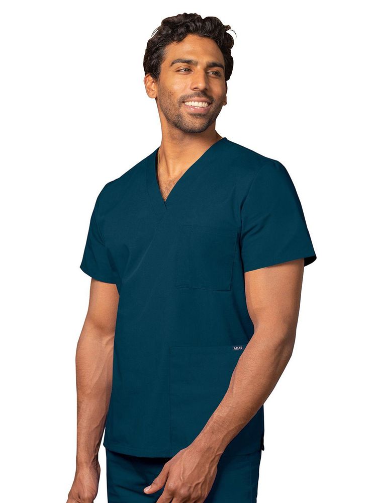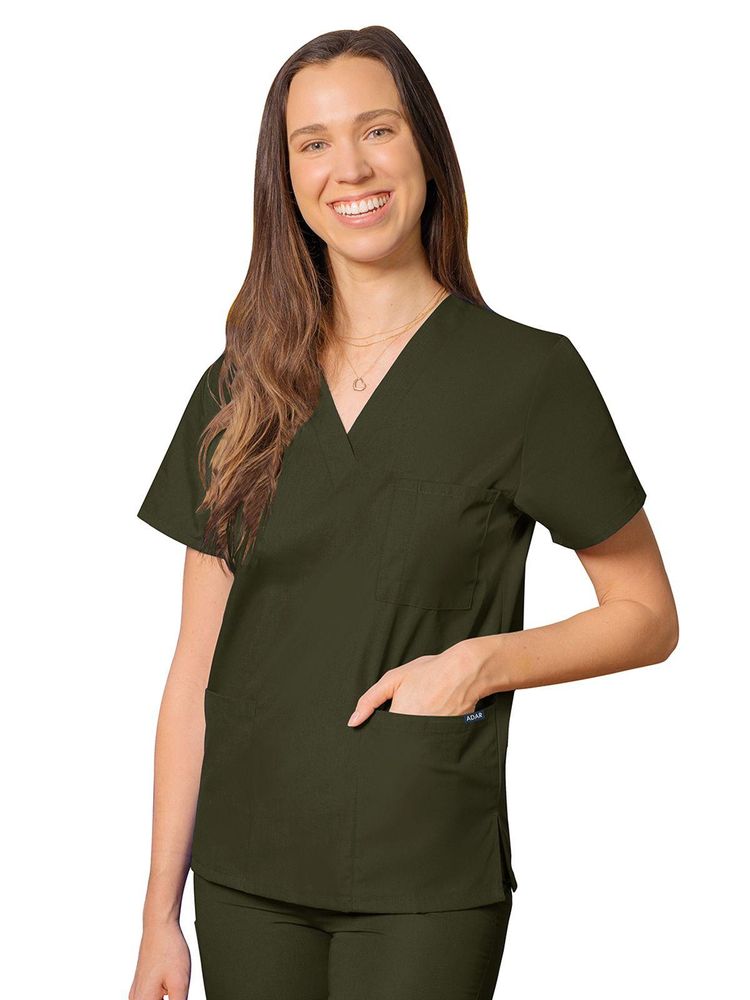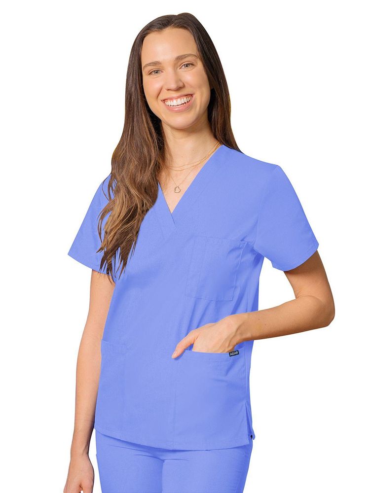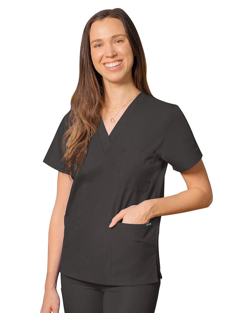 • Forward shoulder for a modern look. Four-way stretch fabric for limitless motion. Two hidden side entry pockets. Modern v-neck design. One shaped chest pocket with pen storage pocket. Woven label. Center back length: 28.5". • Classic Fit • Short set-in sleeves • Two roomy bottom patch pockets • Chest pocket with pen divider • Side vents for easy movement and comfortable fit